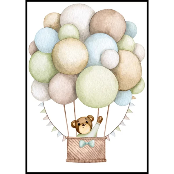 Lyft barnrummet till nya höjder med denna gulliga barntavla med en vinkande björn i en luftballong. Denna söta poster för barnrum sprider en känsla av äventyr och drömmar och passar perfekt för att skapa en fantasifull och inspirerande miljö. Den lilla björnen, med sin glada vinkning och vänliga leende, inbjuder till lek och äventyr.