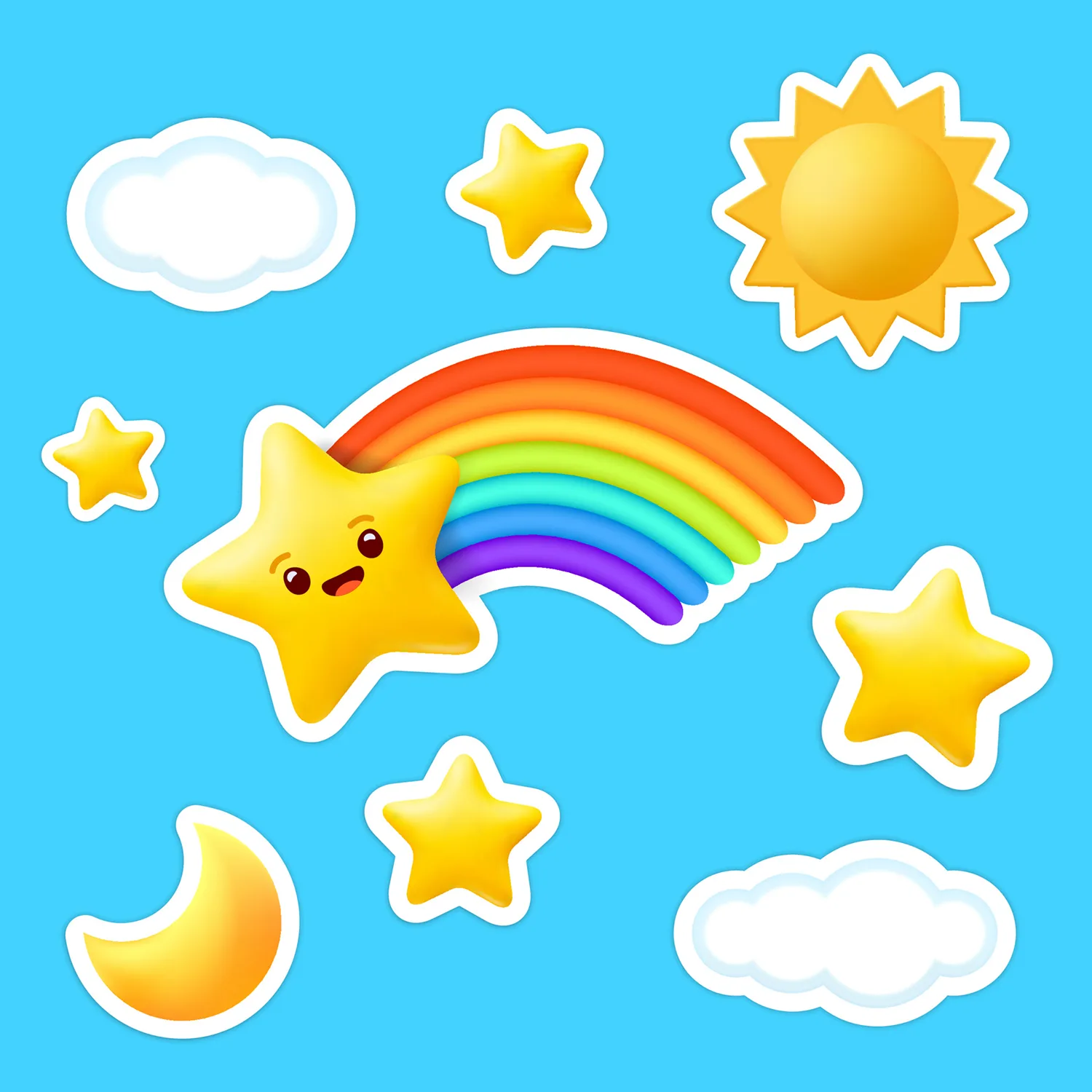 Förvandla en vanlig vägg till en magisk himmel med våra charmiga väggdekor regnbåge emojisar. Detta kompletta set är designat för att sprida glädje och lekfullhet, med en mix av klassiska himmelsmotiv som sol, måne, moln och stjärnor, samt en vacker regnbåge. Dekalerna har mjuka, fina former som uppmuntrar till lek och drömmar.