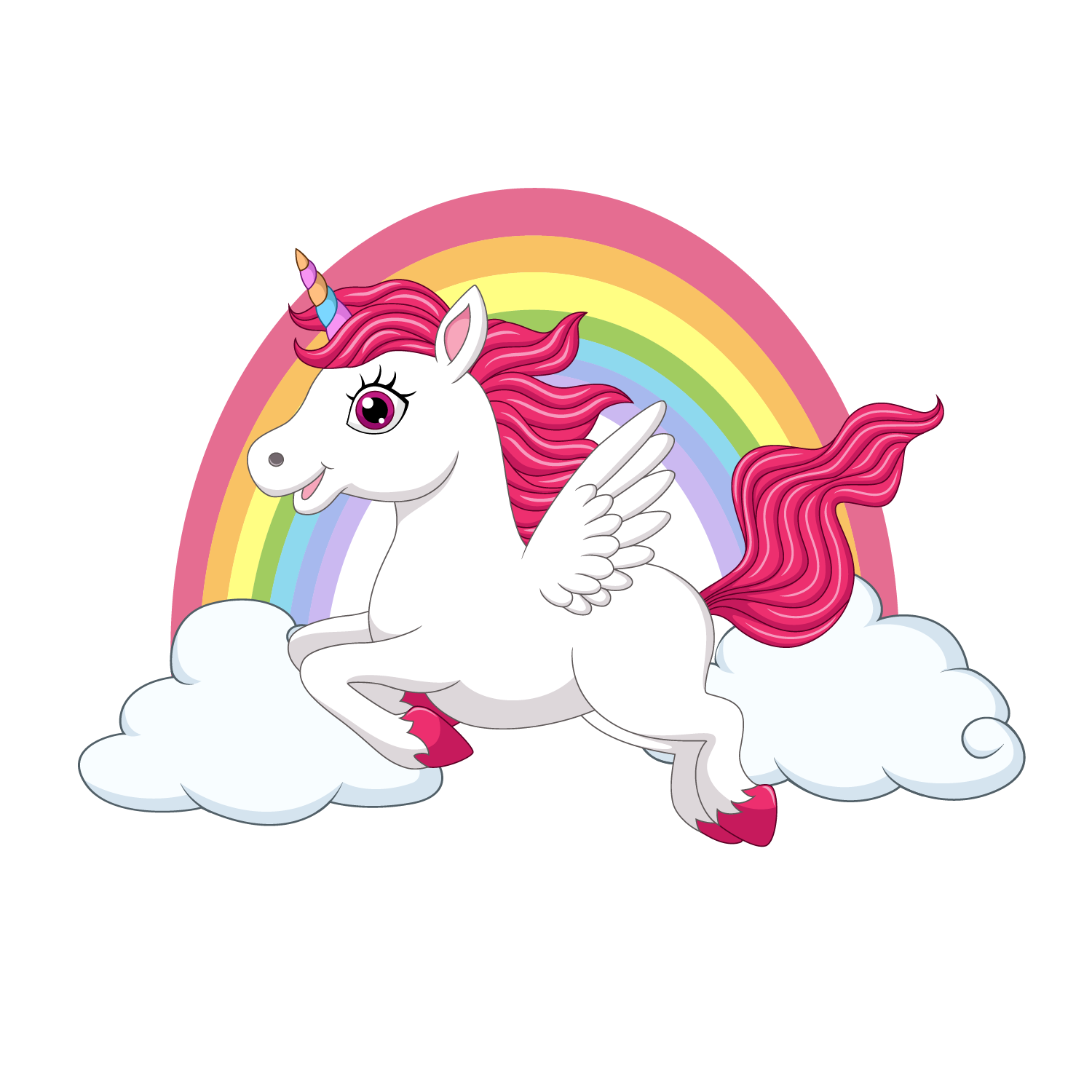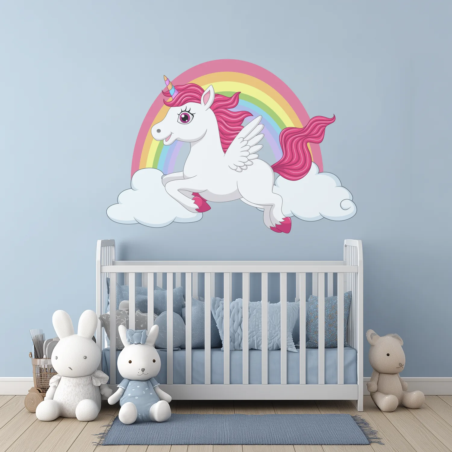 Förvandla barnrummet till en sagovärld med vår förtrollande väggdekor med flygande enhörning. Denna dekal fångar magin perfekt med en vit, flygande enhörning med rosa man, som svävar över molnen framför en klassisk, färgstark regnbåge. Om man gillar både enhörning och regnbåge så är den det givna valet för alla barn.