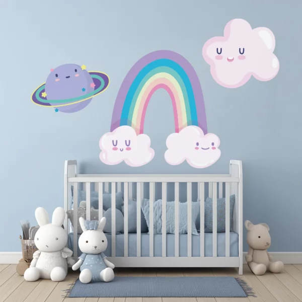 Redo för en ny, spännande inredning? Våra nya väggdekor med regnbåge med planeter är här för att förvandla barnrummet till ett fantastiskt kosmiskt äventyr! Föreställ dig glada planeter, mysiga regnbågar och leende moln på väggen – den perfekta mixen av drömmar och lek. Det är så enkelt att montera, du kan ha ett helt nytt universum uppe på bara några minuter!